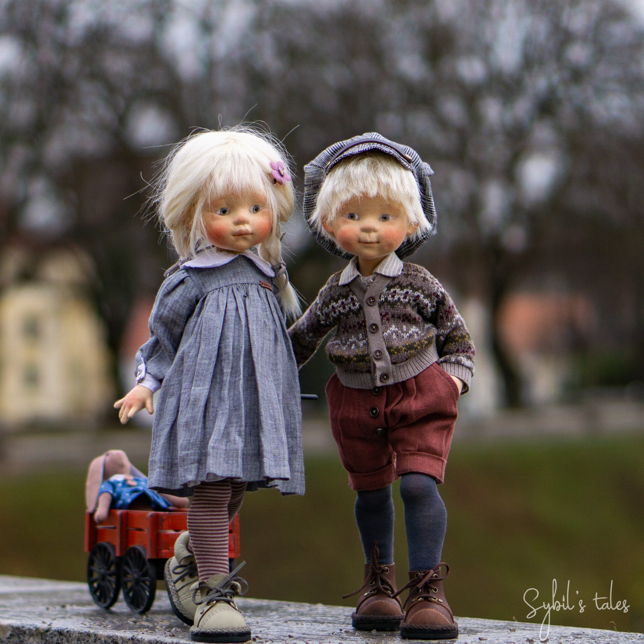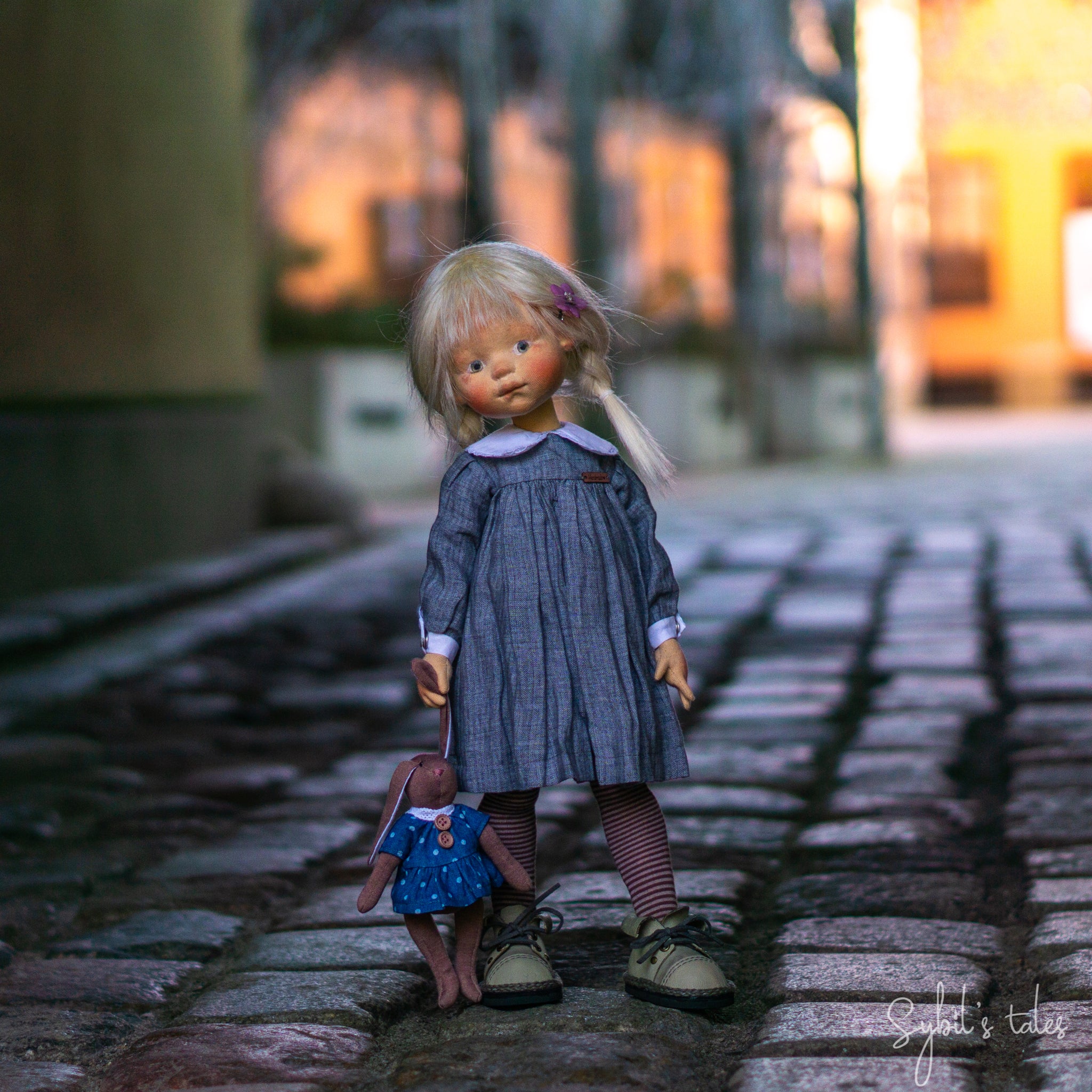 This is a free-standing doll, with proportions resembling a six year old child. Her legs and arms can bend, and she can sit beautifully. The neck can turn side to side, as well as up and down. The entire body is needle-felted from wool, with no stuffed parts. I sculpted the face myself from special clay. The whole doll is covered with fabric made specifically for dollmaking. Her eyes are painted with textile paints, and her cheeks are softly blushed with beeswax crayons. She has natural mohair soft white hair, which should be handled gently. I sew all her outfits using my own original patterns, and I also make the shoes from natural leather. She stands approximately 45-46 cm (17.3 inches) tall and is intended for ages 12+ or adult doll collectors.