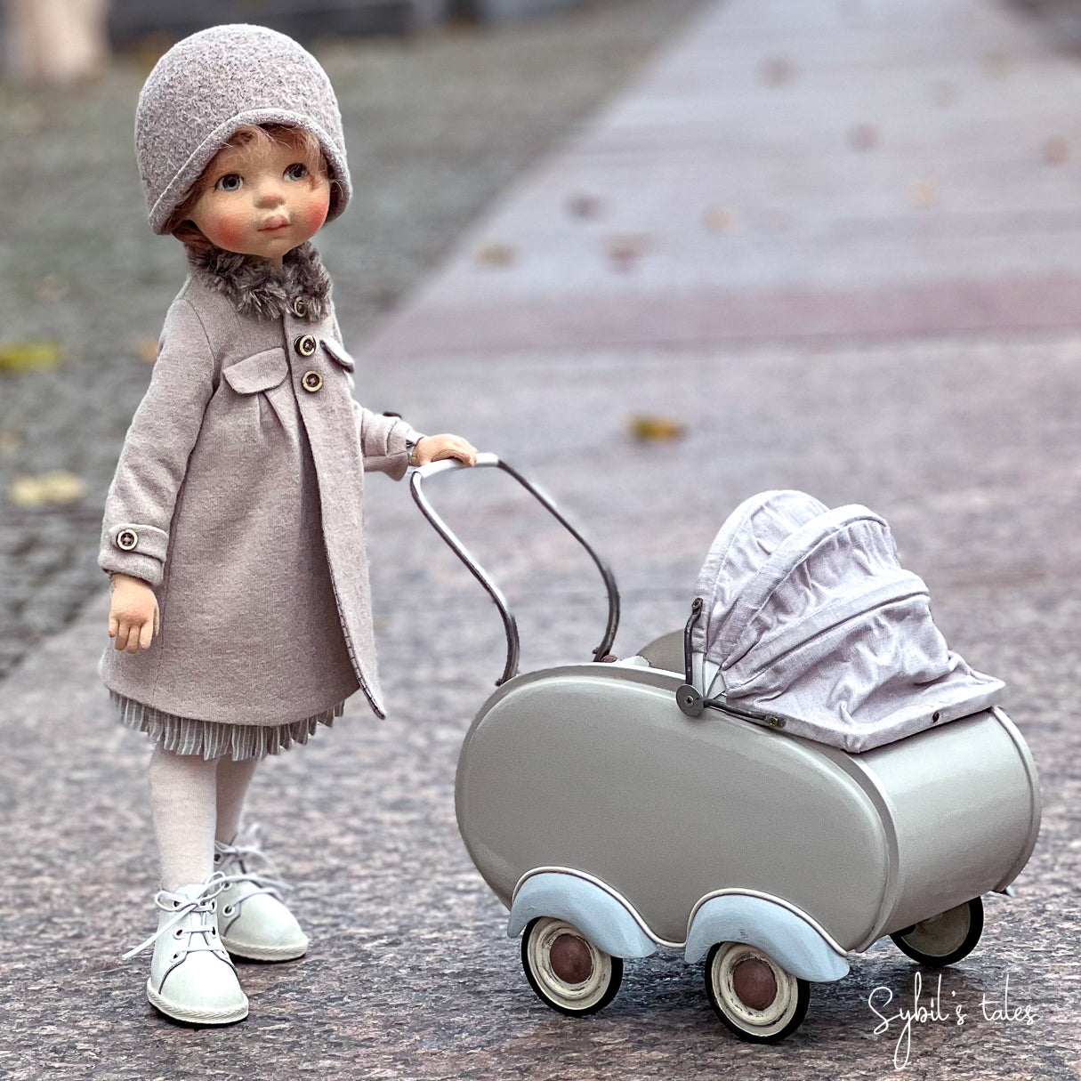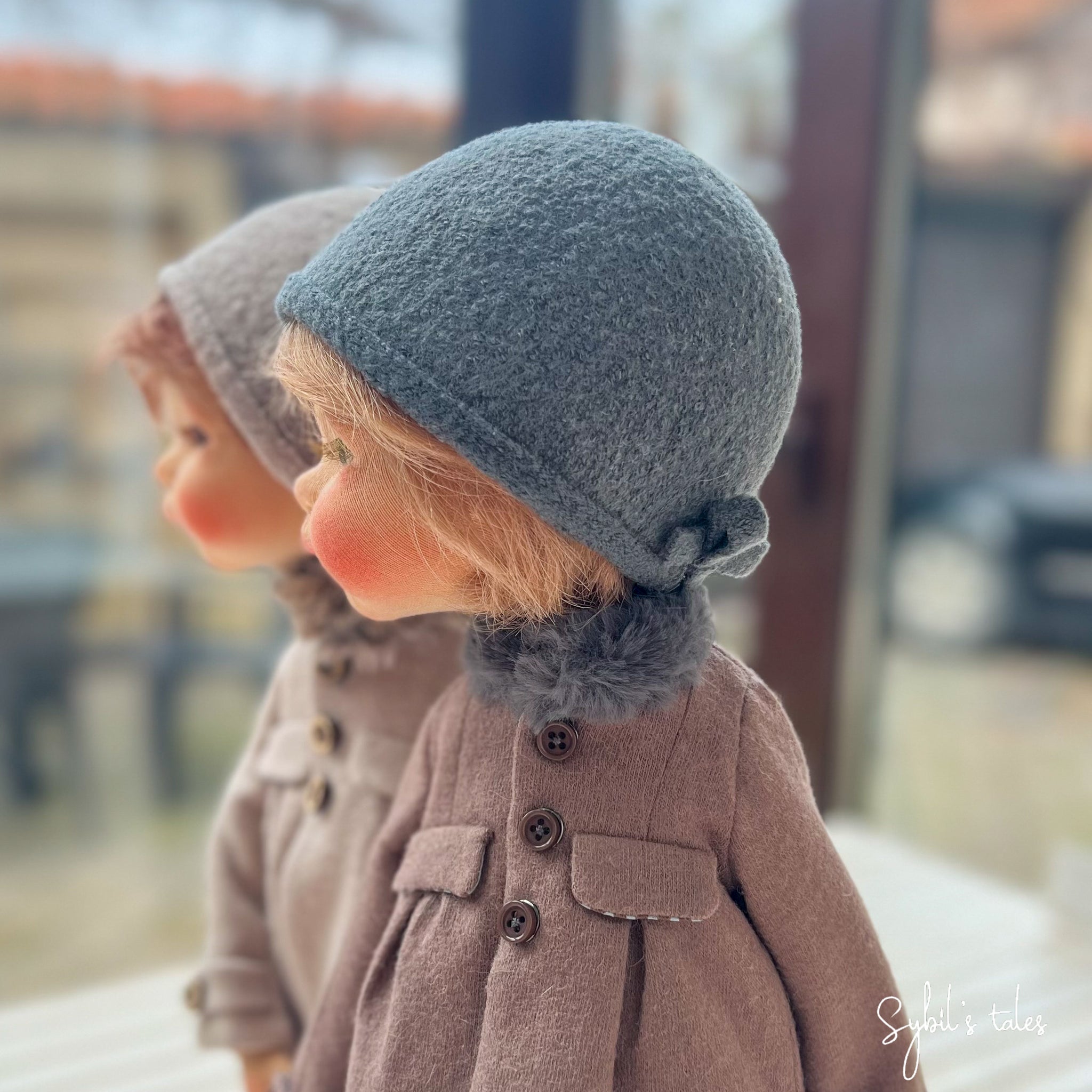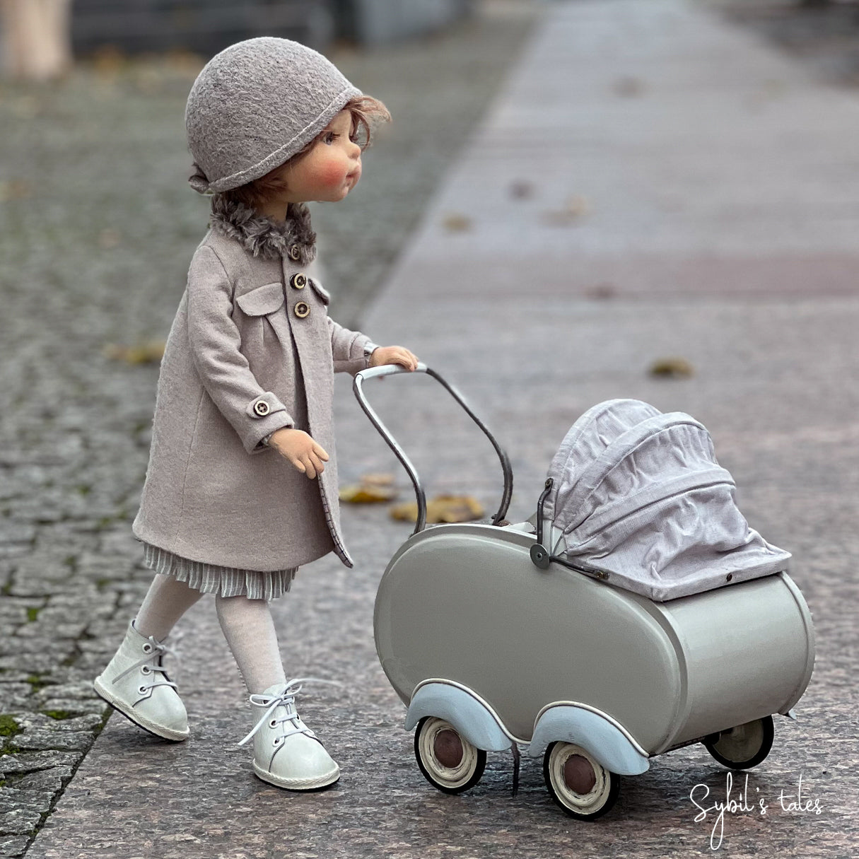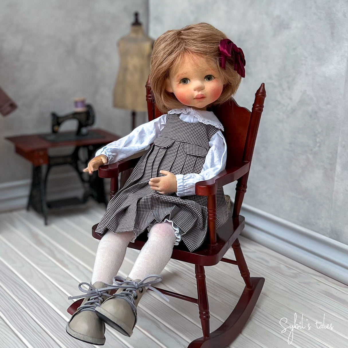 These are free-standing dolls, with proportions resembling a six year old child. Their legs and arms can bend, and they can sit beautifully. The neck can turn sideways, as well as up and down. The entire body is made of wool felt, there are no stuffed parts. I sculpt each face myself from special clay. The whole doll is covered with fabric designed specifically for dollmaking. The eyes are painted with textile paint, and the cheeks are blushed with beeswax crayons. The dolls have natural mohair hair and should be handled gently. I sew each outfit using my own unique patterns and make the shoes from natural leather as well. All three girls from the Autumn series are approximately 45-46 cm (17.3 inches) tall and are intended for ages 12+ or adult doll collectors.