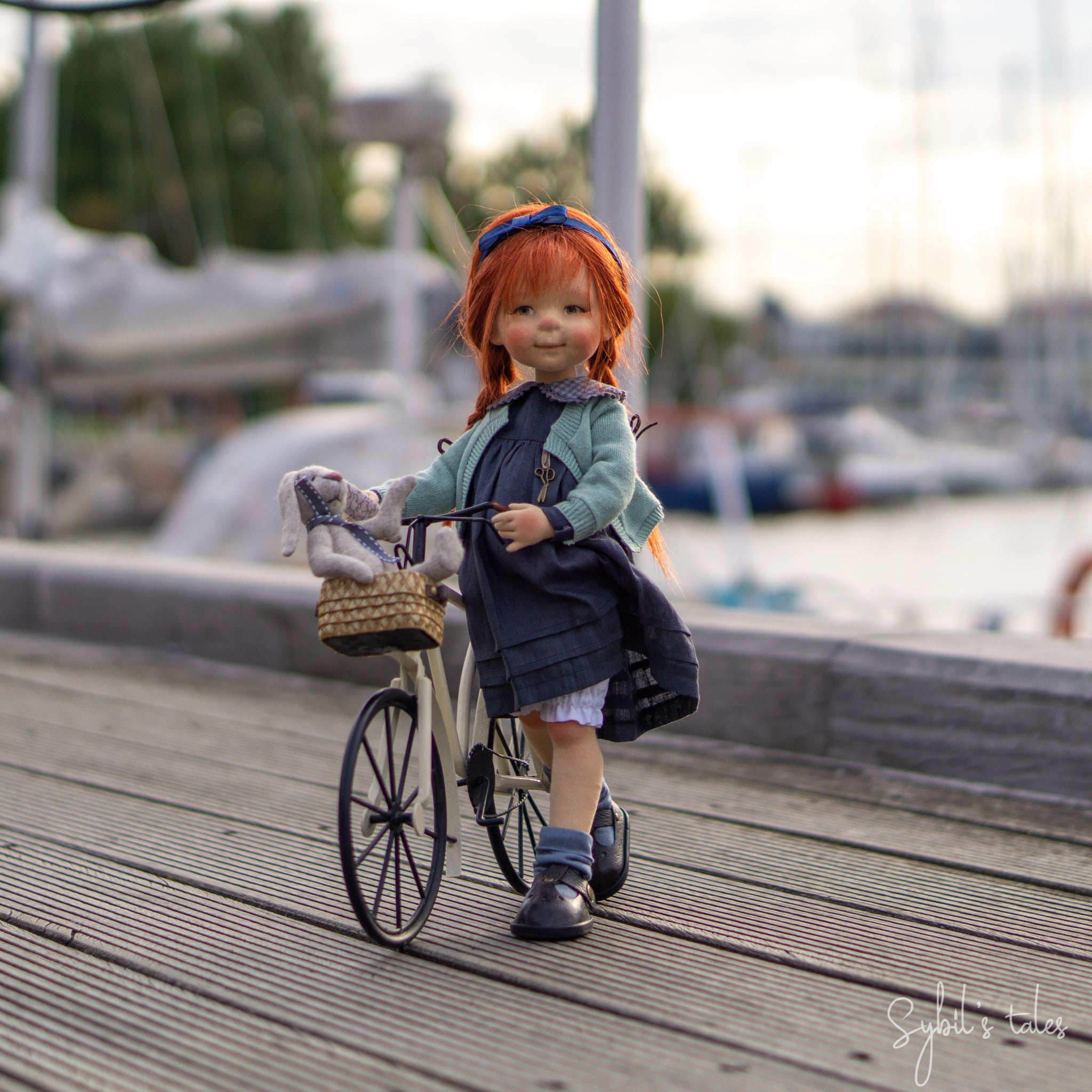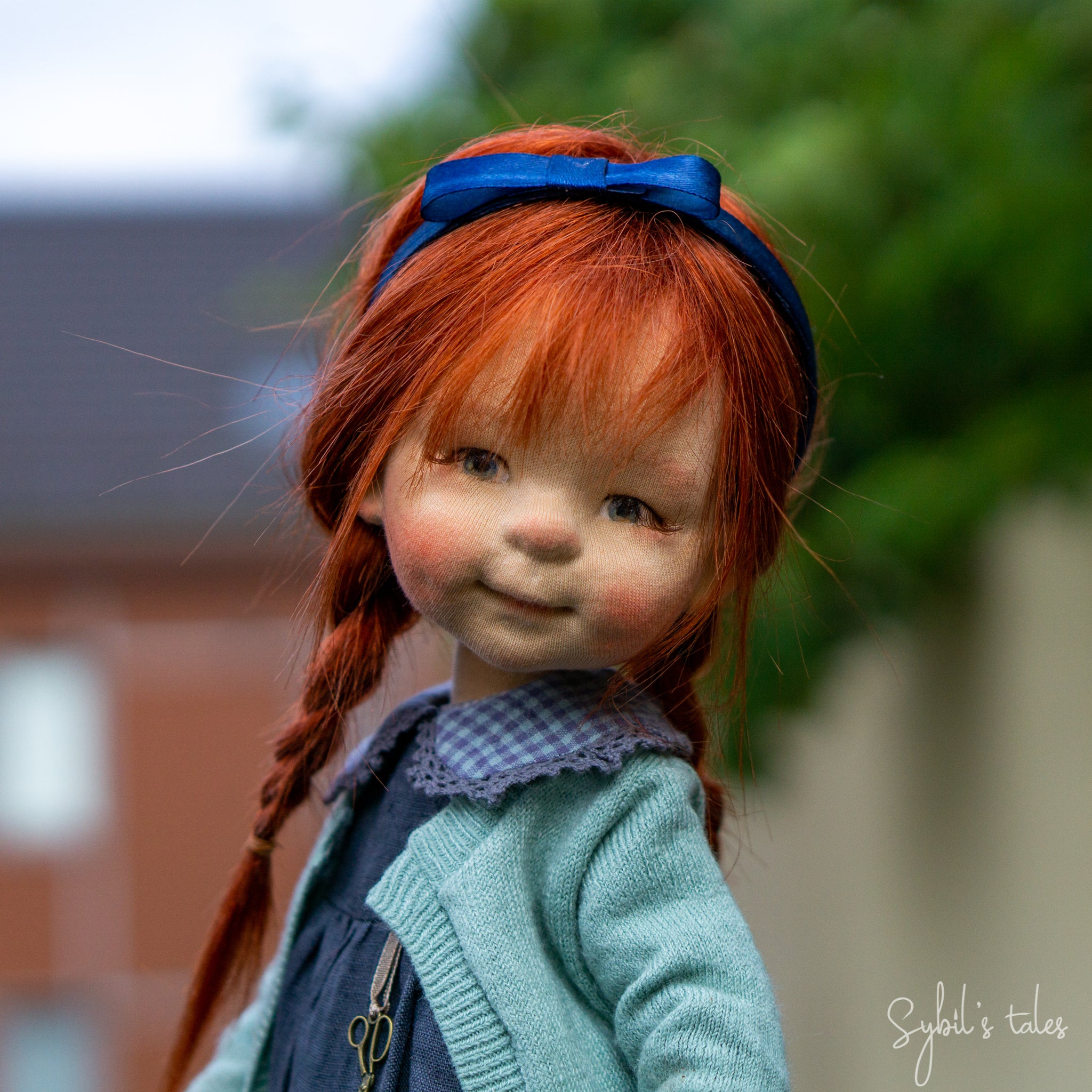 Emmy Lou is a free-standing doll, with proportions resembling a six year old child. Her legs and arms can bend, and she can sit beautifully. The neck can turn side to side, as well as up and down. The entire body is needle-felted from wool, with no stuffed parts. I sculpted the face myself from special clay. The whole doll is covered with fabric made specifically for dollmaking. Her eyes are painted with textile paints, and her cheeks are softly blushed with beeswax crayons. She has natural mohair hair, which should be handled gently. I sew all her outfits using my own original patterns, and I also make the shoes from natural leather. She stands approximately 45-46 cm (17.3 inches) tall.