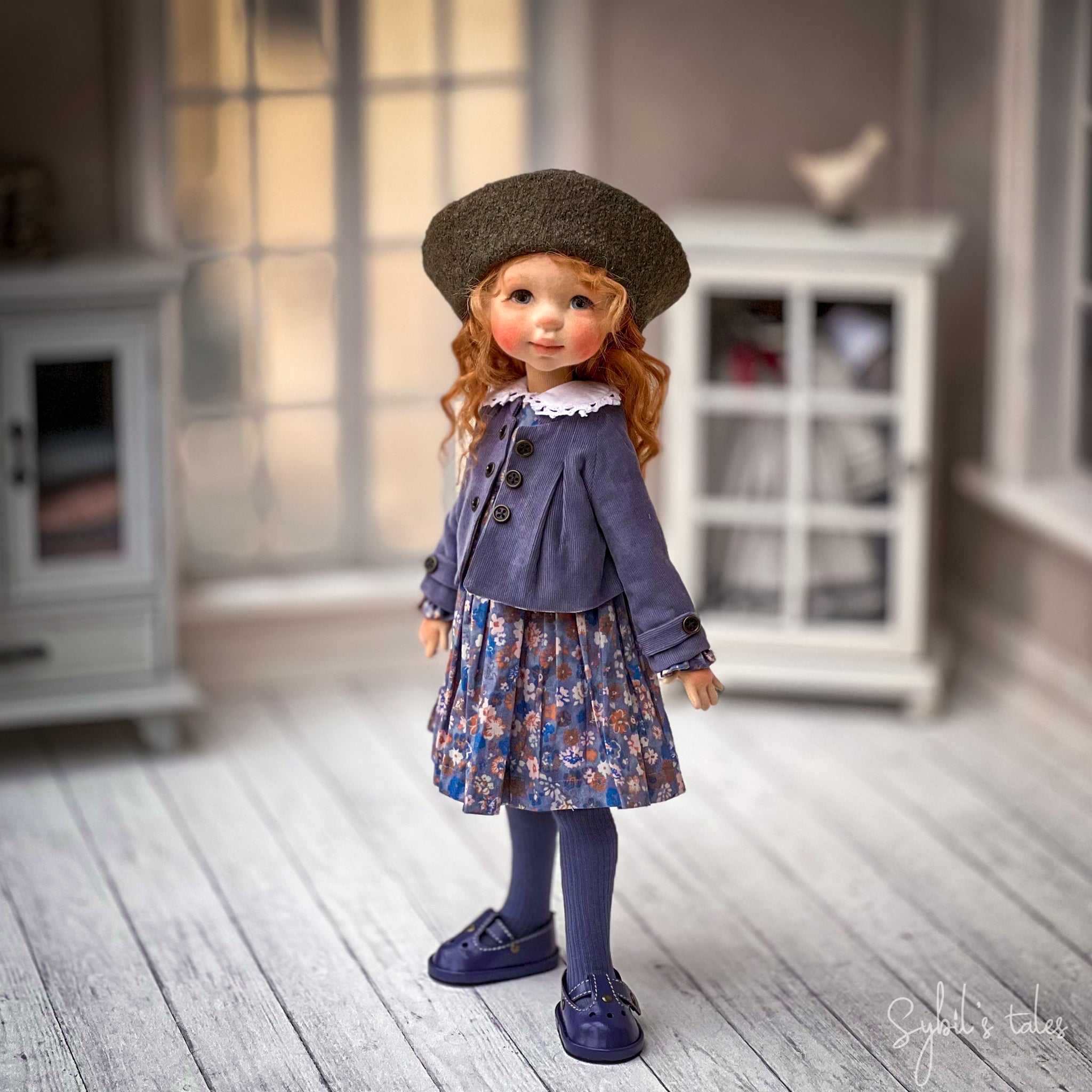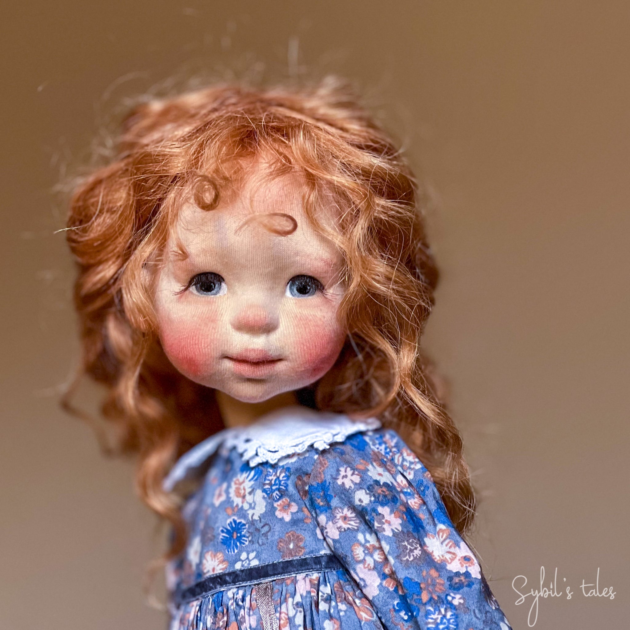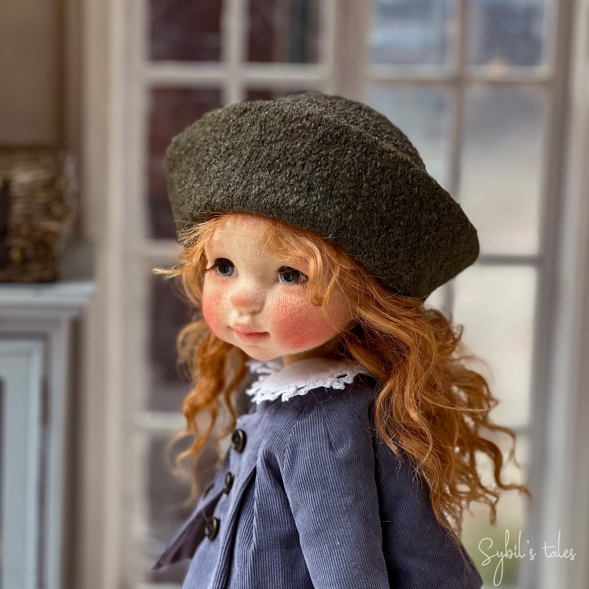 These are free-standing dolls, with proportions resembling a six year old child. Their legs and arms can bend, and they can sit beautifully. The neck can turn sideways, as well as up and down. The entire body is made of wool felt, there are no stuffed parts. I sculpt each face myself from special clay. The whole doll is covered with fabric designed specifically for dollmaking. The eyes are painted with textile paint, and the cheeks are blushed with beeswax crayons. The dolls have natural mohair hair and should be handled gently. I sew each outfit using my own unique patterns and make the shoes from natural leather as well. All three girls from the Autumn series are approximately 45-46 cm (17.3 inches) tall and are intended for ages 12+ or adult doll collectors.