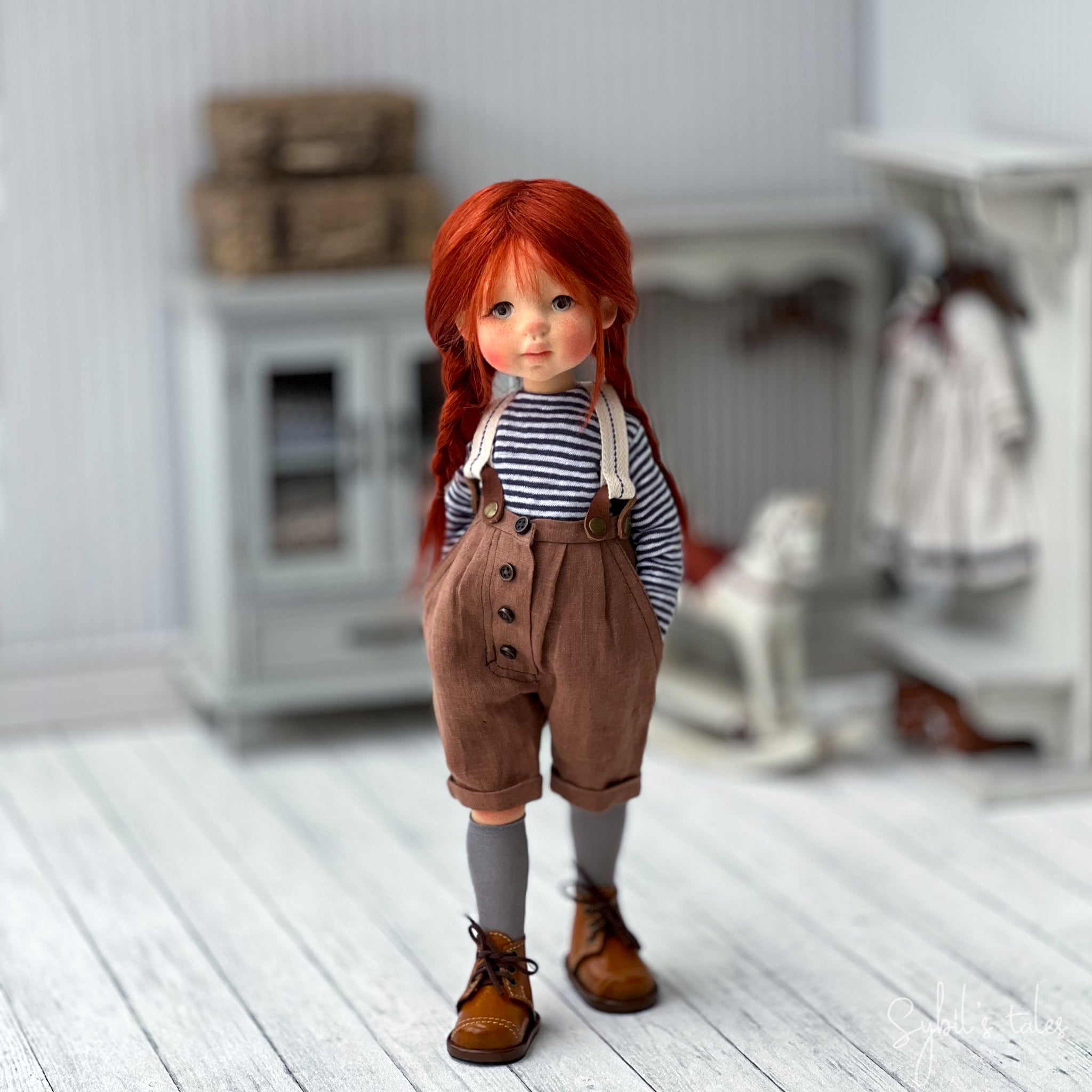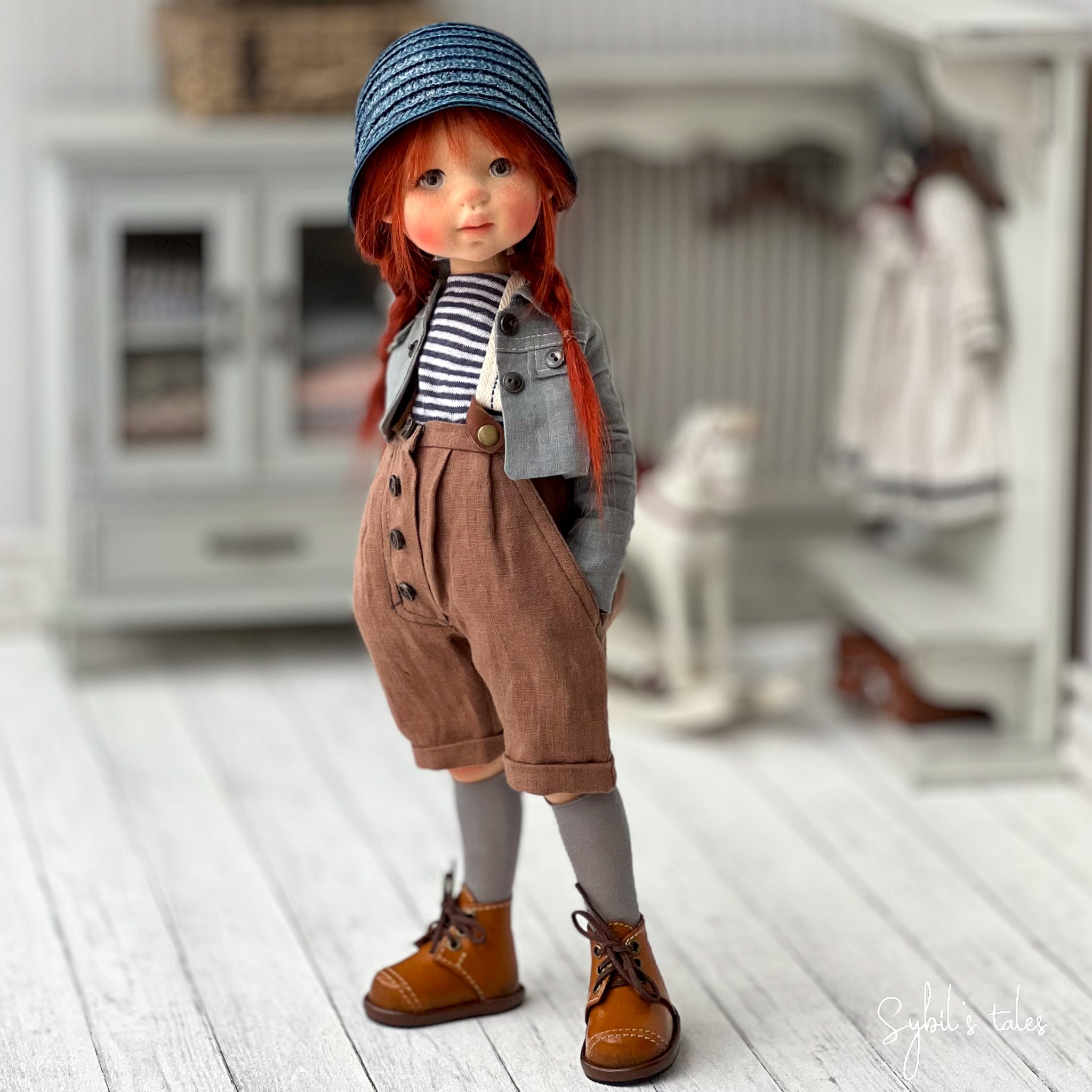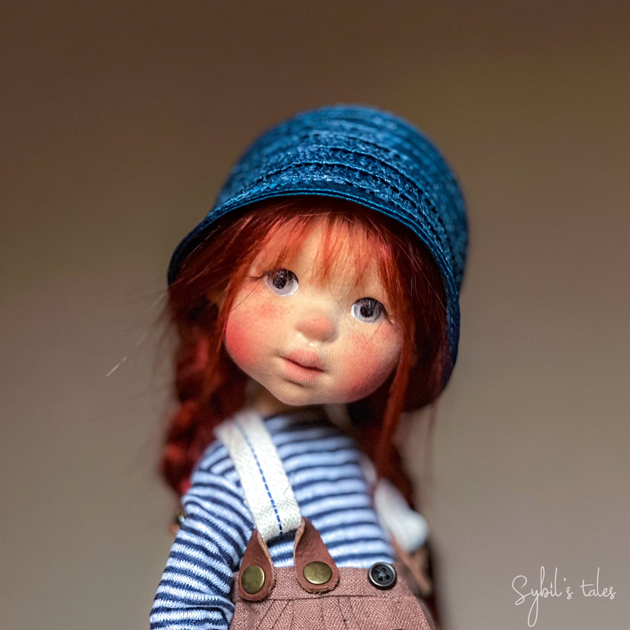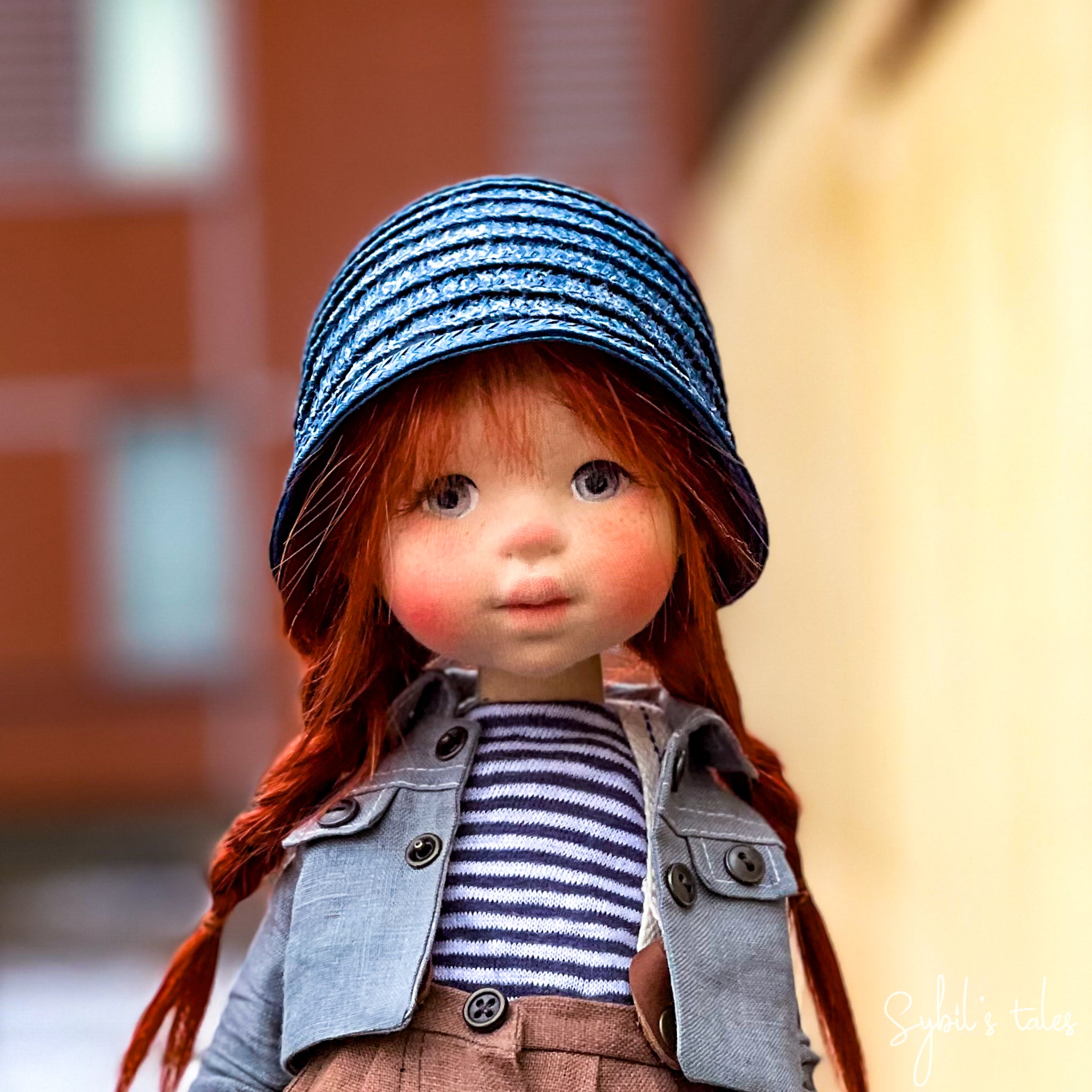 Tabitha is a free-standing doll, with proportions resembling a six year old child. Her legs and arms can bend, and she can sit beautifully. The neck can turn side to side, as well as up and down. The entire body is needle-felted from wool, with no stuffed parts. I sculpted the face myself from special clay. The whole doll is covered with fabric made specifically for dollmaking. Her eyes are painted with textile paints, and her cheeks are softly blushed with beeswax crayons. She has natural mohair hair, which should be handled gently. I sew all her outfits using my own original patterns, and I also make the shoes from natural leather. She stands approximately 45-46 cm (17.3 inches) tall and is intended for ages 12+ or adult doll collectors.